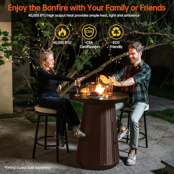 3-Piece Metal Patio Conversation Set with Brown Round Gas Bar Height Fire Pit Table, Swivel Chairs and Cushions
