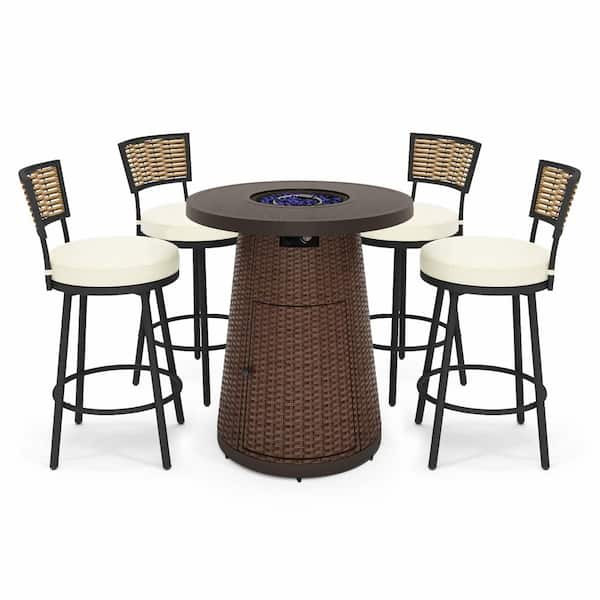 5-Piece Metal Patio Conversation Set with Brown Round Gas Bar Height Fire Pit Table, Swivel Chairs and Cushions