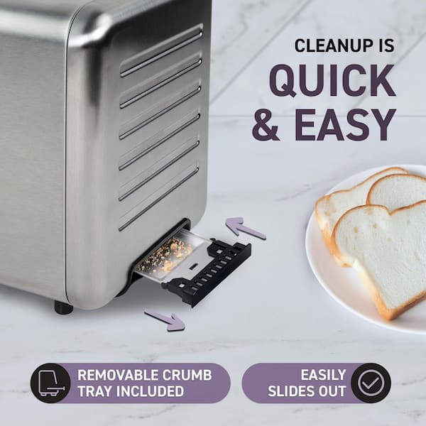 • Removable crumb tray included to make cleanup easy