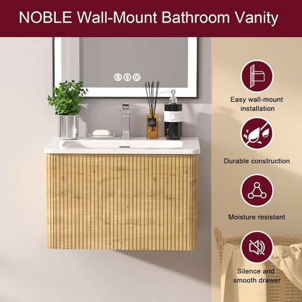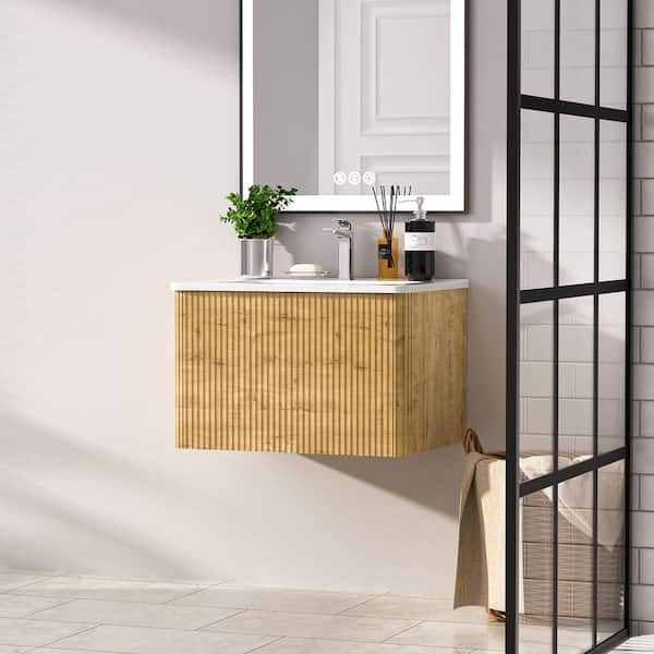 24 in. Wall Mount Modern Single Sink Striped Oak Bath Vanity with One-Piece White Ceramic Sink Top Sink Pre-assembled