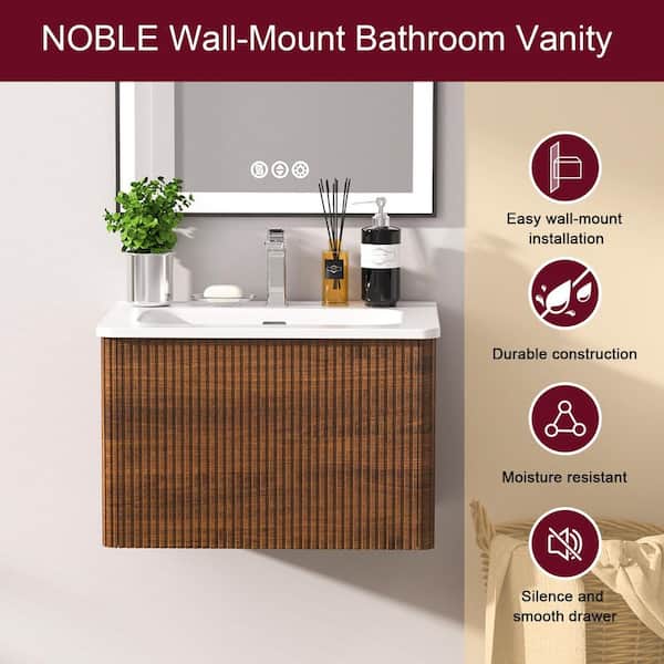 24 in. Wall Mount Modern Single Sink Striped Walnut Bath Vanity with One-Piece White Ceramic Sink Top Sink Pre-assembled