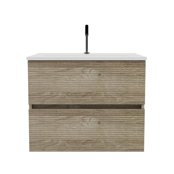 Glory 24 in. Single Sink Wall Mounted Natural Oak Bath Vanity with White Integrated Ceramic Top Sink