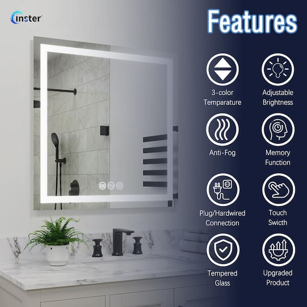 MOC 36 in. W x 36 in. H Square Frameless LED Lighted Wall Mount Bathroom Vanity Mirror with Memory Function