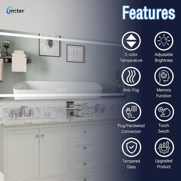MOC 96 in. W x 36 in. H Large Rectangular Frameless LED Lighted Wall Mount Bathroom Vanity Mirror with Memory Function