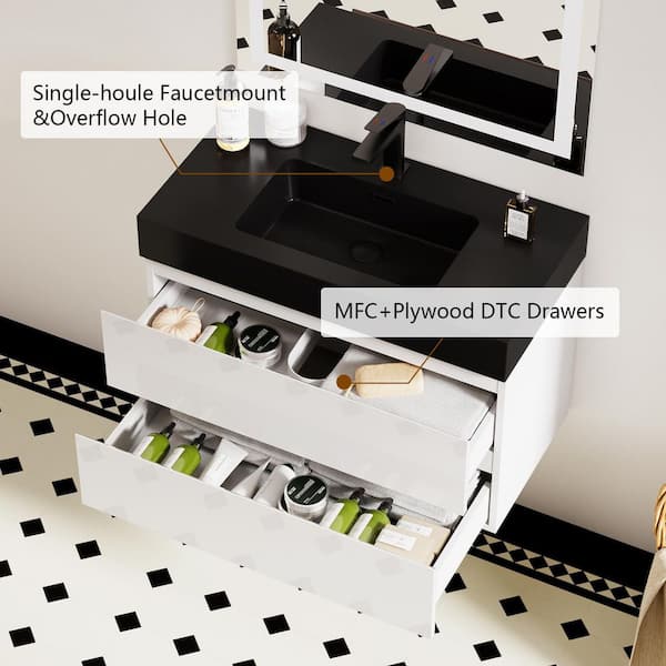 NOBLE 24 in. W x 18 in. D x 25 in. H Single Sink Floating Bath Vanity in White with Black Solid Surface Integral Top