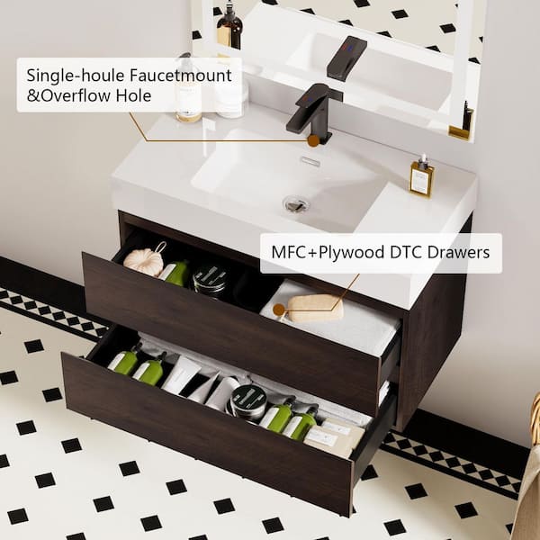 NOBLE 30 in. W x 18 in. D x 25 in. H Single Sink Floating Bath Vanity in Wood with White Solid Surface Integral Top