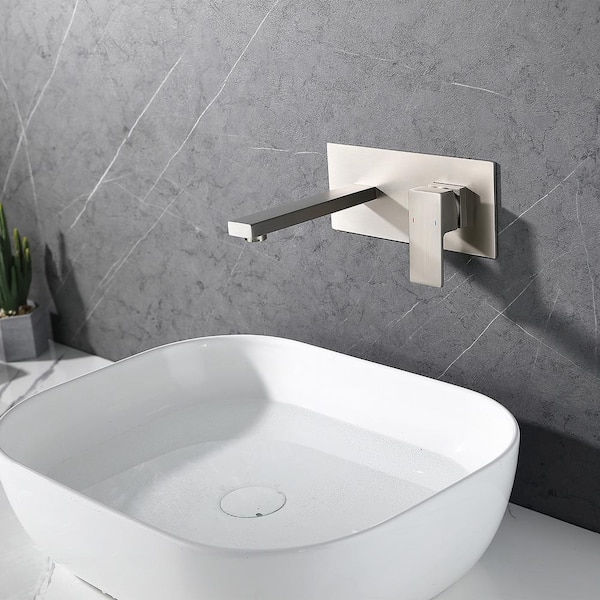 Single Handle Wall Mount Faucet for Bathroom Sink or Bathtub with Plate in Brushed Nickel Brass Rough-in Valve Included