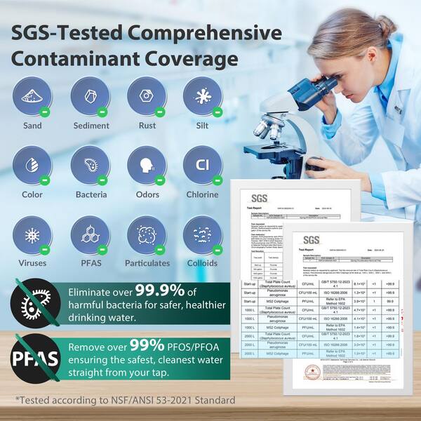 • Removes up to 99.4% of PFAS and up to 99.99% of harmful pathogens