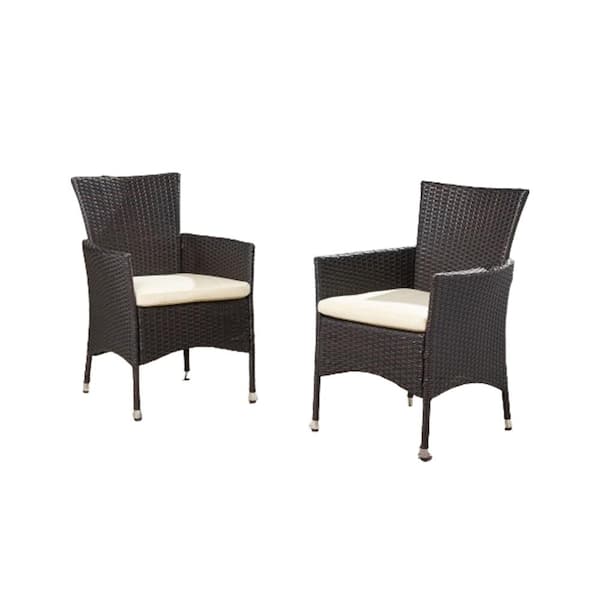 2-Piece Outdoor Brown PE Wicker Dining Chair Set with Beige Cushions