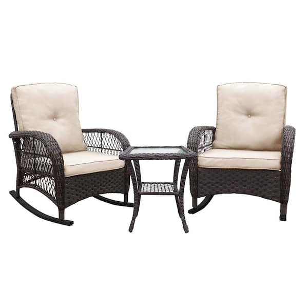 3-Piece Conversation Set Brown Wicker Outdoor Rocking Chair with Beige Cushion and Glass Top Side Table