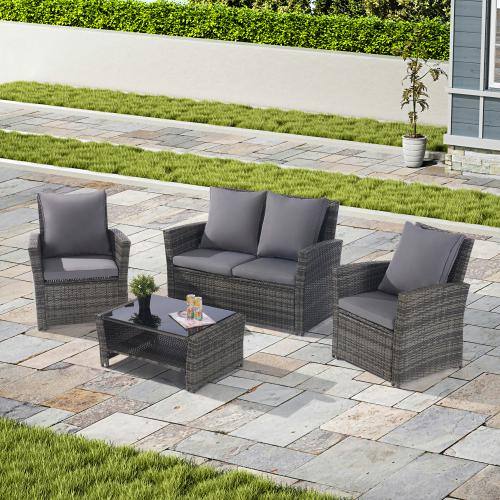 4-Pieces Wicker Outdoor Patio Dark Gray PE Conversation Set with Tempered Glass Coffee Table and Dark Gray Cushions