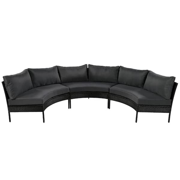 Black 3-Pieces. Metal Outdoor Sectional Set with Gray Cushions All Weather Curved Rattan Conversation Set