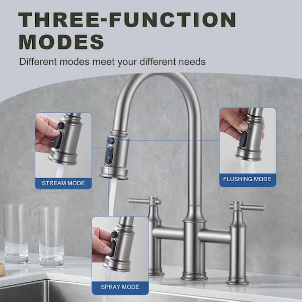 1 or 3 Holes Brass Double Handle Bridge Kitchen Faucet with 3-Mode Pull Down Sprayer and Supply Lines in Brushed Nickel