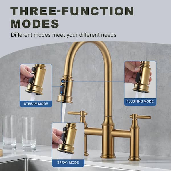 1 or 3 Holes Brass Double Handle Bridge Kitchen Faucet with 3-Mode Pull Down Sprayer and Supply Lines in Gold