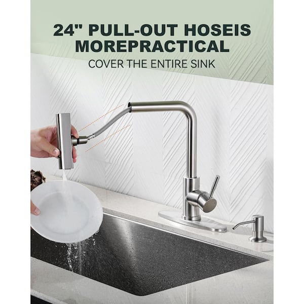 13.5in. H Single Handle 360° Swivel Pull Out Sprayer Kitchen Faucet w/3-Spray Modes and Soap Dispenser in Brushed Nickel