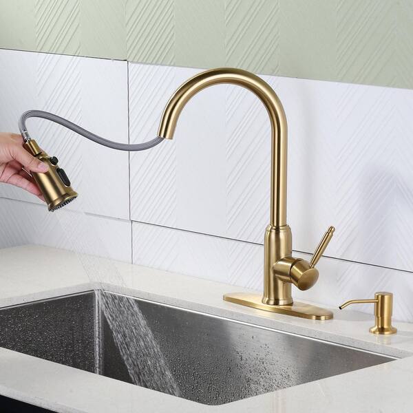15.4 in. Single Handle Pull Down Sprayer Kitchen Faucet with 360° Swivel Spout, Soap Dispenser in Stainless Steel Gold