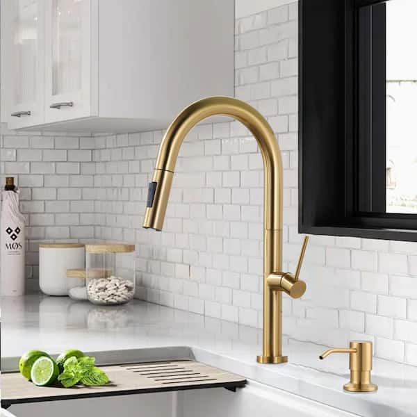 2-Functions Stainless Steel Single Handle Pull Down Sprayer Kitchen Faucet with Soap Dispenser Included in Brushed Gold