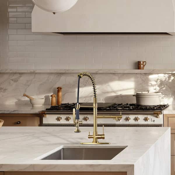 22.3 in. Commercial Double Handle Brass Pre-Rinse Spring Pull Down Sprayer Kitchen Faucet with 360° Swing Spout in Gold