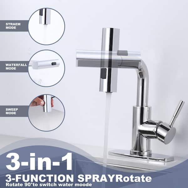 3 Modes Single Handle Stainless Steel Waterfall Bar Faucet with Pull Down Sprayer and Deckplate in Polished Chrome