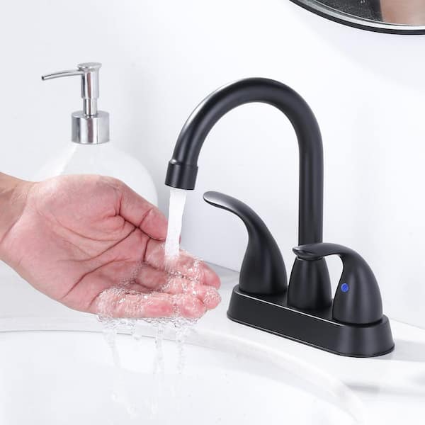 4 in. Centerset Double Handle High Arc Bathroom Faucet with Drain Kit Included and 360° Swivel Spout in Matte Black