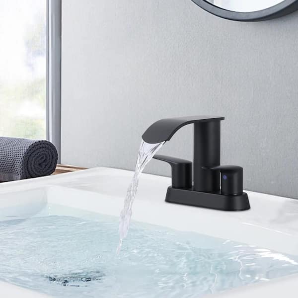 4 in. Centerset Double Handle Waterfall Bathroom Faucet with Drain Kit Included in Matte Black