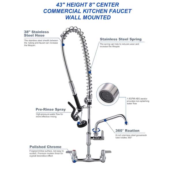 43 in. Commercial Wall Mount 3-Handle Brass Pull Down Sprayer Kitchen Faucet with Pre-Rinse Sprayer and Spout in Chrome