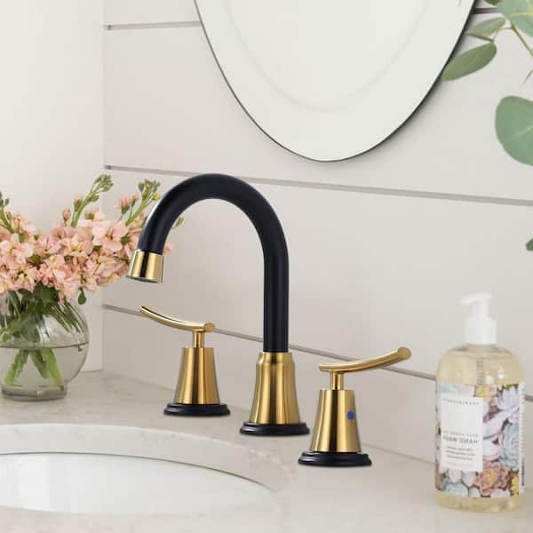 8 in. Widespread Double Handle Bathroom Faucet with Pop Up Drain Included and 360° Swivel Spout in Black and Gold