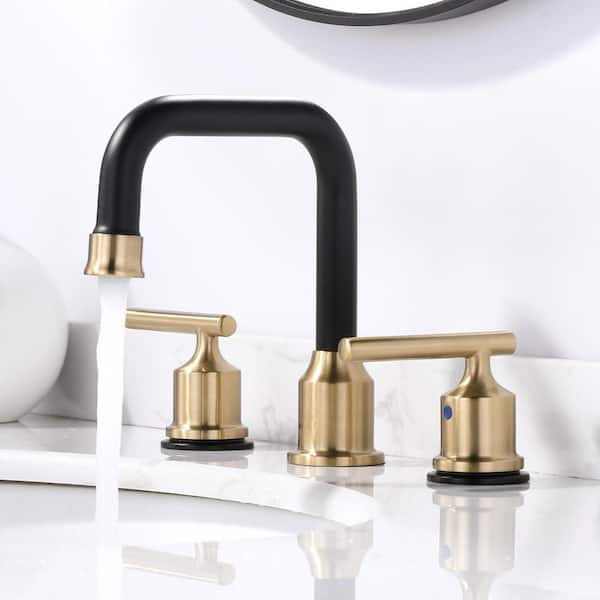8 in. Widespread Double Handle High Arc Bathroom Faucet with Pop-up Drain and Supply Lines in Black and Gold (1-Pack)