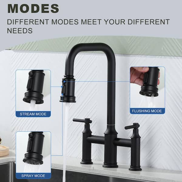 Brass Double Handle Bridge Kitchen Faucet with 3-Mode Pull-Down Sprayer and 1 or 3-Hole Install in Matte Black