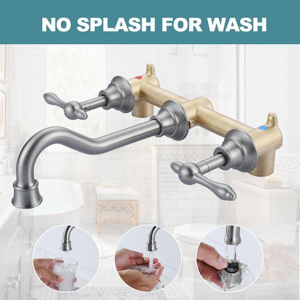 Brass Double Handle Wall Mounted Faucet 8 in. Centerset 3 Hole Bathroom Faucet with Brass Value in Brushed Nickel