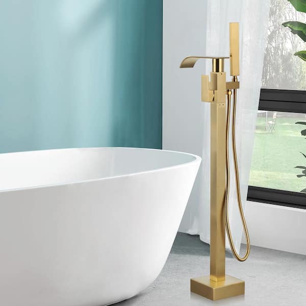 Brass Single-Handle Freestanding Tub Faucet 1.8 GPM 360° Swivel Waterfall Tub Filler Spout with Handheld Shower in. Gold
