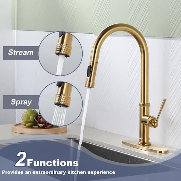 Brass Single Handle Pull Down Sprayer Kitchen Faucet with 2-Mode Advanced Spray, Deck Plate and Supply Lines in Gold