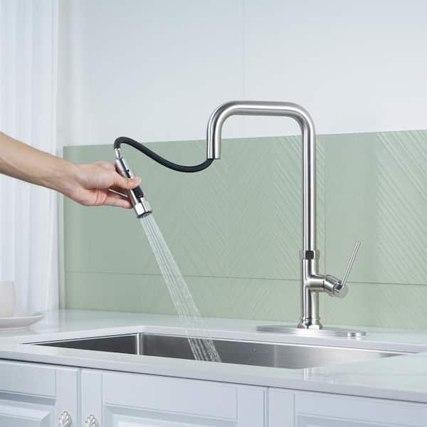 Brass Single Handle Pull Down Sprayer Kitchen Faucet with Advanced Spray, Deck Plate and Supply Lines in Brushed Nickel