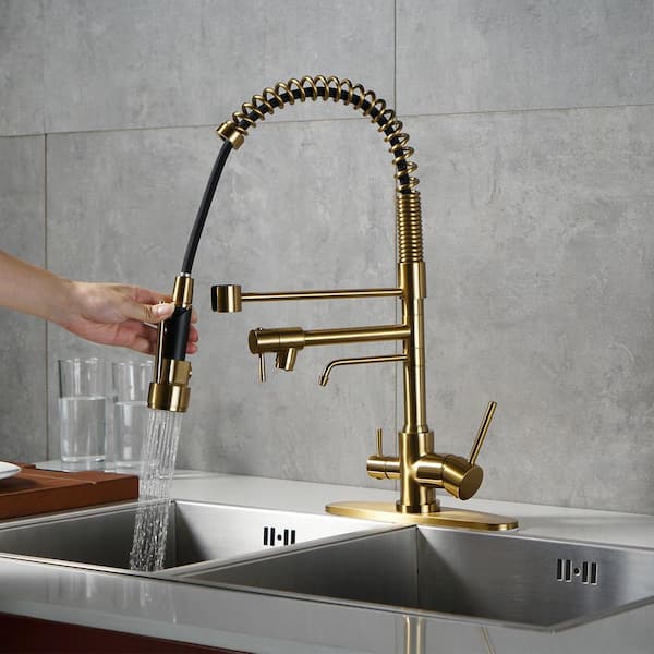 Brass Triple Handle 20 in. H 3-Sprayer 360° Swivel Pull Down Sprayer Kitchen Faucet Water Filter Faucet Combo in Gold