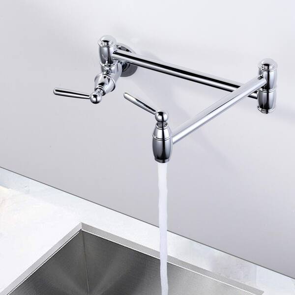 Brass Wall Mount Pot Filler with Brass Valve, 2-Handles, Double Joint Swing Arms and 2-Aerators in Polished Chrome