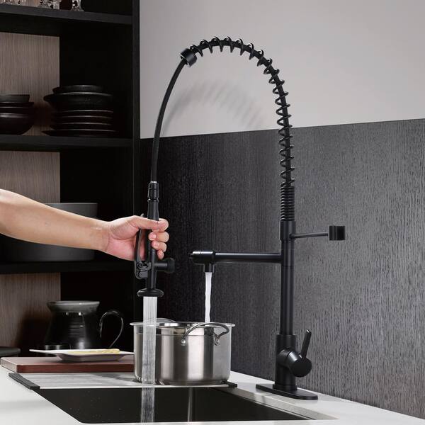 Commercial Deck Mount Double Handle Pull Down Sprayer Kitchen Faucet with Pre-Rinse, Soap Dispenser in Matte Black