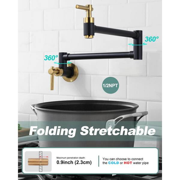 Contemporary Brass Wall Mount Pot Filler with Double Handles and Swing Arm Folding Kitchen Faucet in Black and Gold
