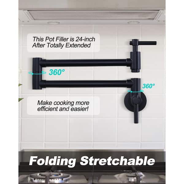 Contemporary Brass Wall Mount Pot Filler with Double Handles and Swing Arm Folding Kitchen Faucet in Matte Black
