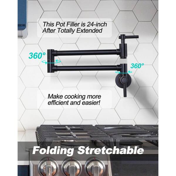 Contemporary Brass Wall Mount Pot Filler with Double Handles and Swing Arm Folding Kitchen Faucet in Oil Rubbed Bronze
