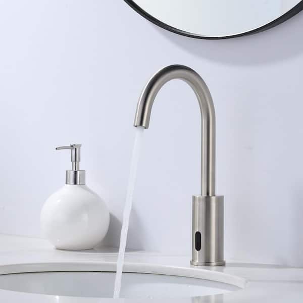 DC Powered Commercial Sensor Touchless Single Hole High-Arc Bathroom Faucet with Deck Plate in Brushed Nickel