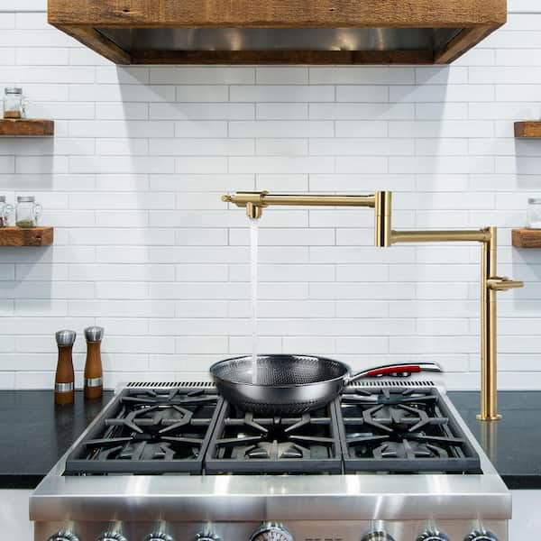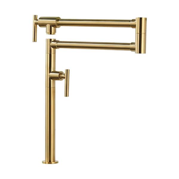 Deck Mounted Brass Pot Filler Kitchen Faucet with Double Handle and Joint Swing Arm in Gold
