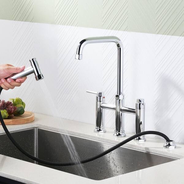 Elegant Brass Double Handle Bridge Kitchen Faucet with Side Sprayer, 59 in. Hose, and Supply Lines in Polished Chrome