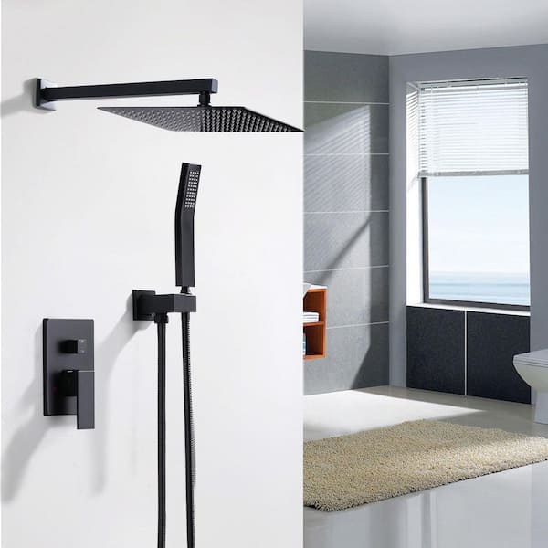 Single Handle 1-Spray Dual Wall Mount 12 in. Fixed and Handheld Shower Head 1.8 GPM with Brass Rough-in Valve in Black