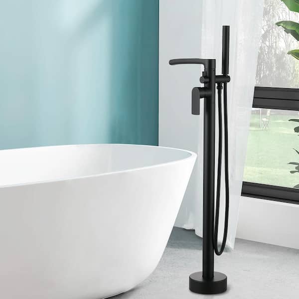 • Freestanding bathtub faucet with handheld shower wand