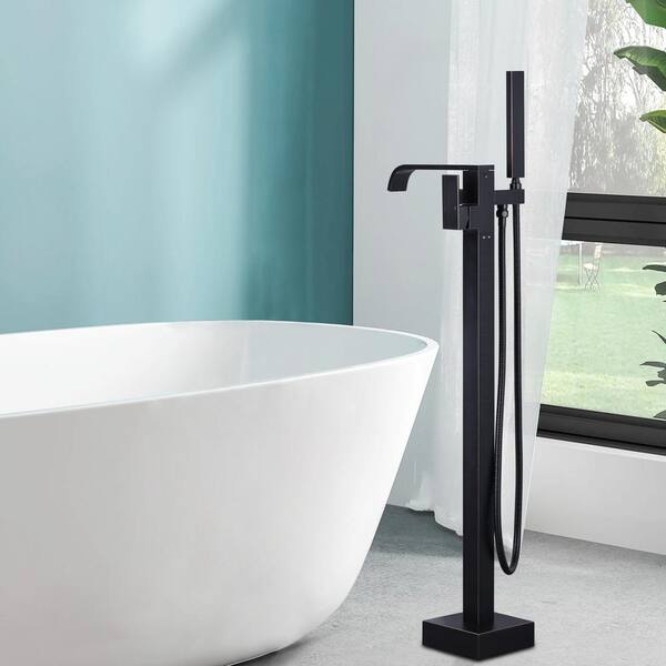 Single-Handle Floor Mount Waterfall Brass Freestanding Tub Faucet with High Flow Handheld Shower in Oil Rubbed Bronze