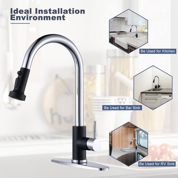 Single Handle Pull Down Sprayer Kitchen Faucet with 3-Modes Advanced Spray and Deck Plate in Black and Polished Chrome