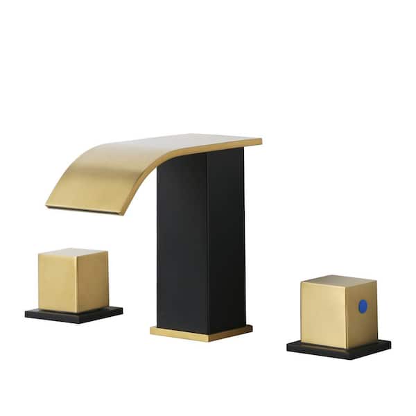 Stainless Steel 8 in. Widespread Double Handle Waterfall Bathroom Faucet with Drain and Supply Lines in Black and Gold