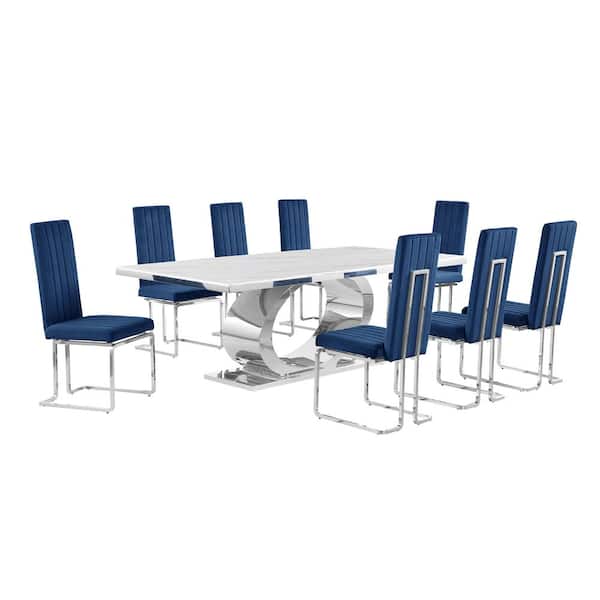 Ibraim 9-Piece Rectangle White Marble Top Stainless Steel Base Dining Set with 8 Navy Blue Velvet Chrome Iron Chairs
