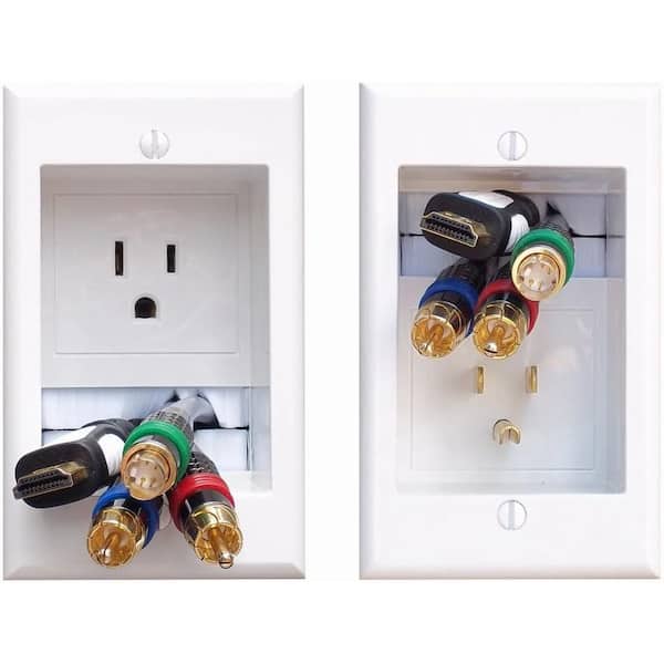 In-Wall Cable Management Kit with Recessed Single Outlet and HDMI Pass-Through for Wall Mounted TVs in White