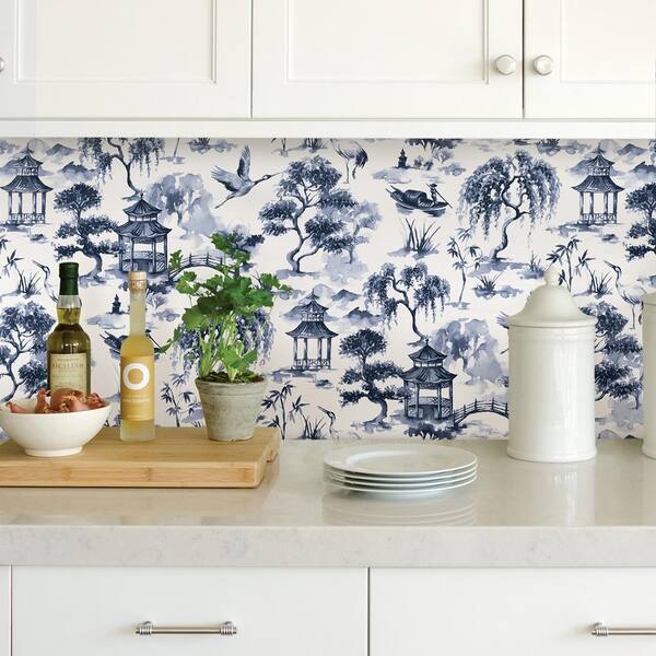 Blue Oriental Scene Peel and Stick Vinyl Wallpaper